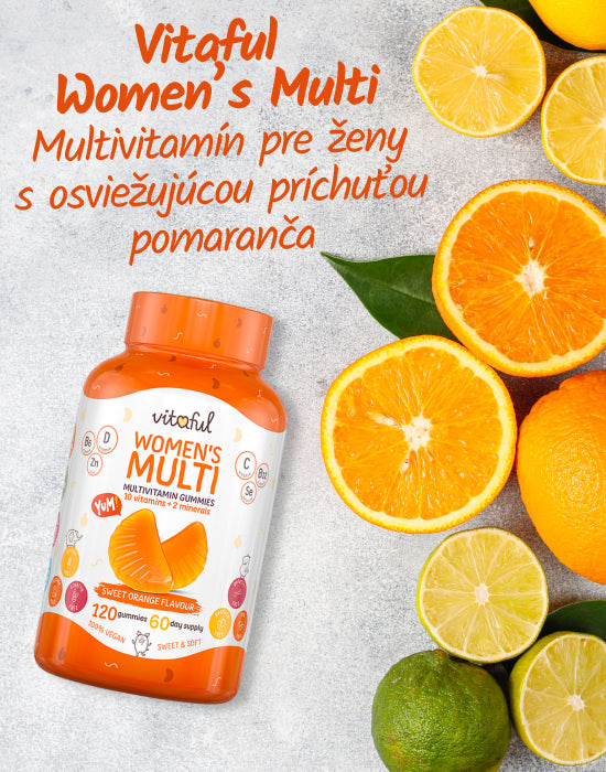Vitaful Women’s Multi je komplexný ženský multivitamínový prípravok v podobe zvodne lahodných pomarančových gumených vitamínov.